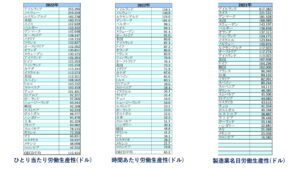 下記の表1に①ひとり当たり②時間あたり③製造業における労働生産性を示しますが、①がOECD加盟38か国中31位の$85,329②が30位の$52.3③が18位の$94,155であり、とても先進国と呼ばれる数値ではないことがはっきりとわかります。