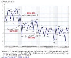 よく「失われた30年」という言葉がメディアで使われますが、それは下記のグラフ1の「低成長期(経済成長率0.8%)」を指して使われます。